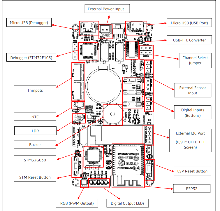 Bu geliştirme kartı, ESP32 ve STM32G030 mikrodenetleyicilerini içerir. ESP32, çift çekirdekli işlemcisi, WiFi ve Bluetooth desteği, dijital giriş/çıkışları, dahili antenleri ve gelişmiş analog özellikleri ile öne çıkar. STM32G030 ise ARM Cortex-M0+ çekirdeği, düşük güç tüketimi, geniş bağlantı seçenekleri, yüksek hızlı giriş/çıkış pinleri ve esnek bellek yapısıyla dikkat çeker. Bu iki mikrodenetleyici, kartın temelini oluşturur ve farklı uygulama alanları için geniş bir potansiyel sunar.